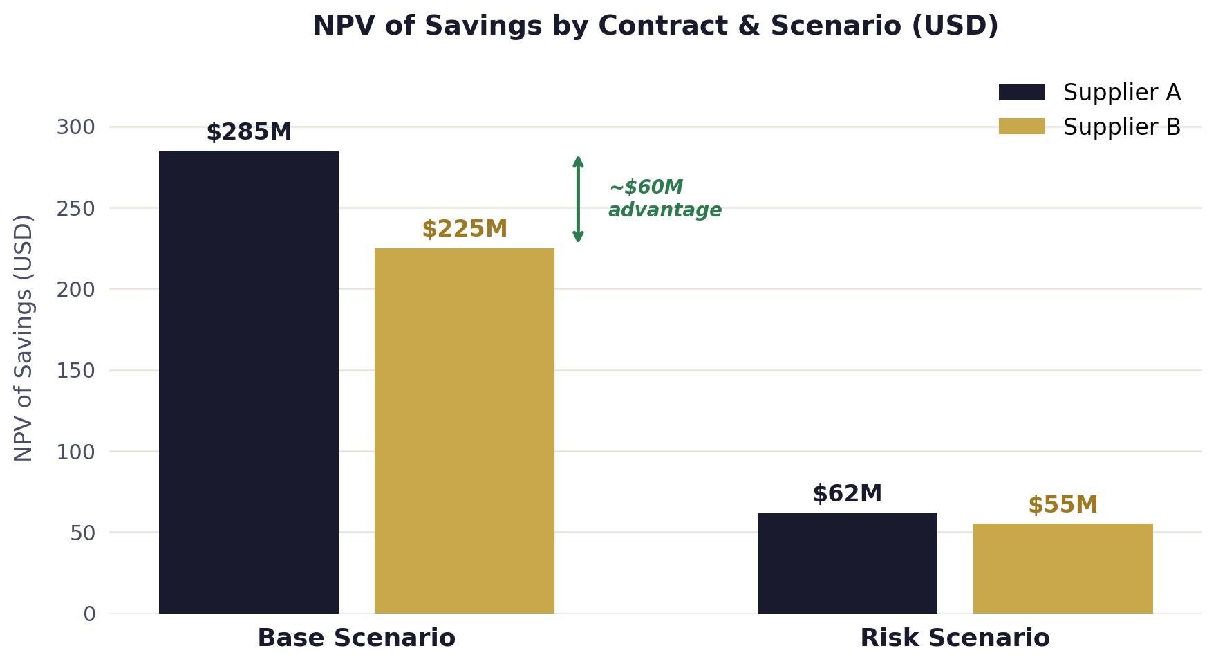 The engagement concluded with a recommendation in favor of Supplier A, grounded in the probability-weighted assessment that the Base scenario was more likely than the Risk scenario, and that the incremental ~$60M USD NPV advantage — concentrated in the near-term years where confidence was highest — outweighed Supplier B’s downside protection benefit.