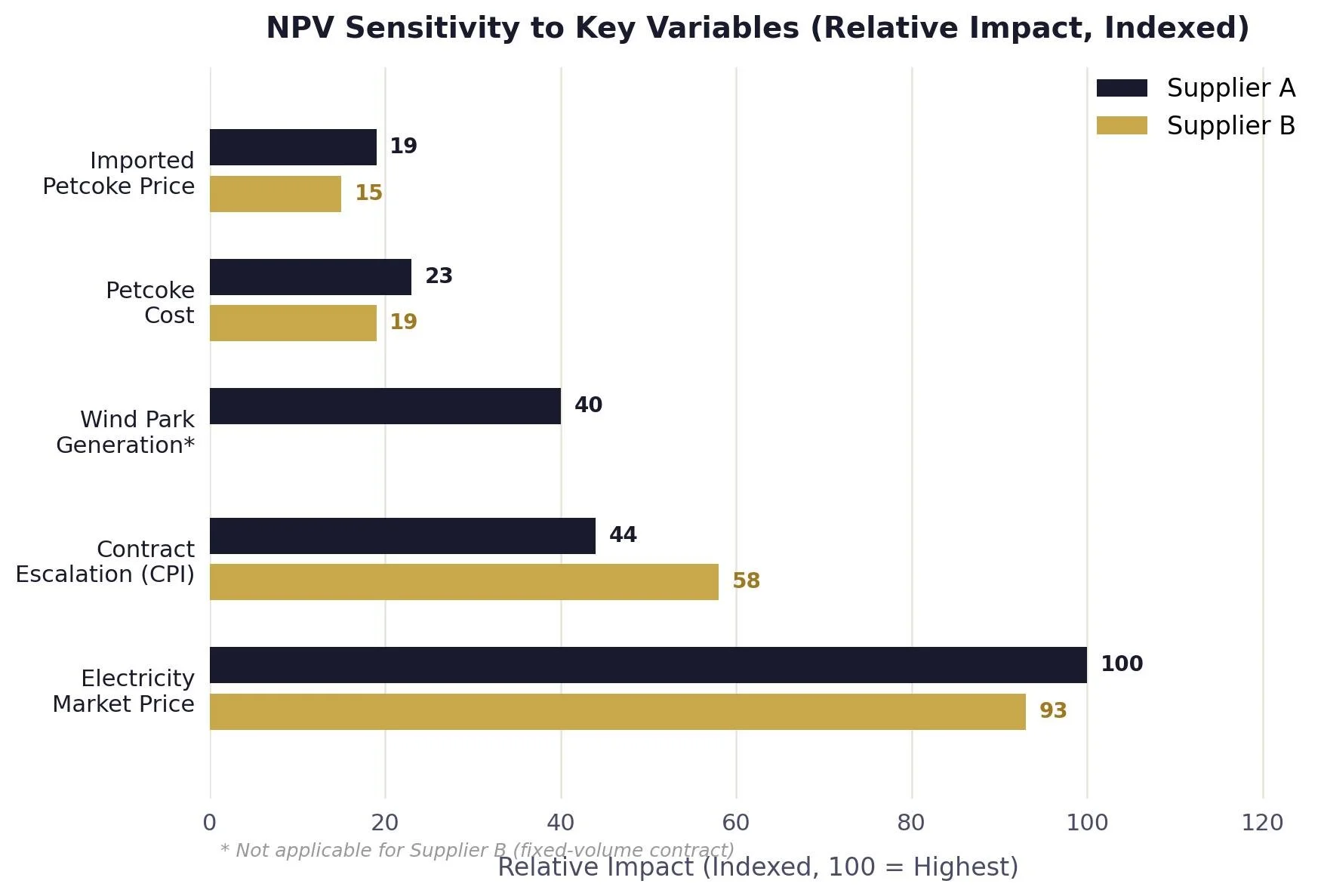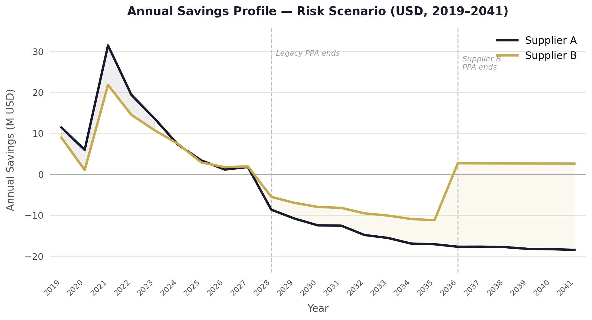 Under the Risk scenario, the NPV advantage of Supplier A narrowed substantially, converging with Supplier B as accelerated market price deterioration and renewable oversupply eroded the value of Supplier A’s larger, longer, as-produced volume position. Stress testing revealed that Supplier A’s NPV reached zero at a market energy price CAGR of −8%, versus −10% for Supplier B — reflecting Supplier B’s greater structural resilience due to its shorter term, fixed volume, and guaranteed delivery profile.