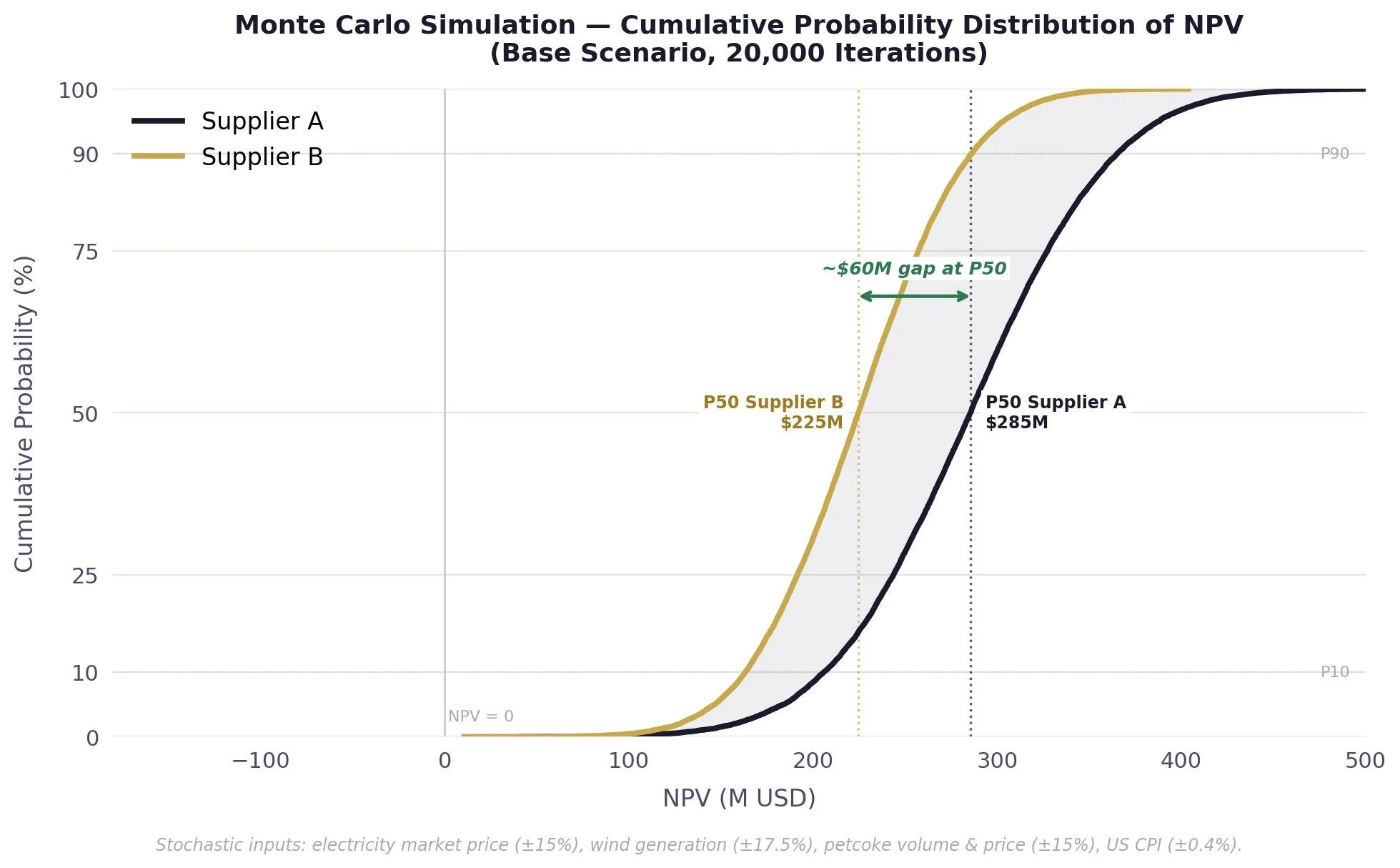 Under the Base scenario — assessed as the most likely outcome — Supplier A was estimated to deliver approximately $60M USD in additional NPV versus Supplier B over the analysis horizon, driven primarily by higher energy and REC surplus revenues in the first seven years of the contract when market price certainty was greatest. The stochastic model confirmed this finding across the majority of the probability distribution.