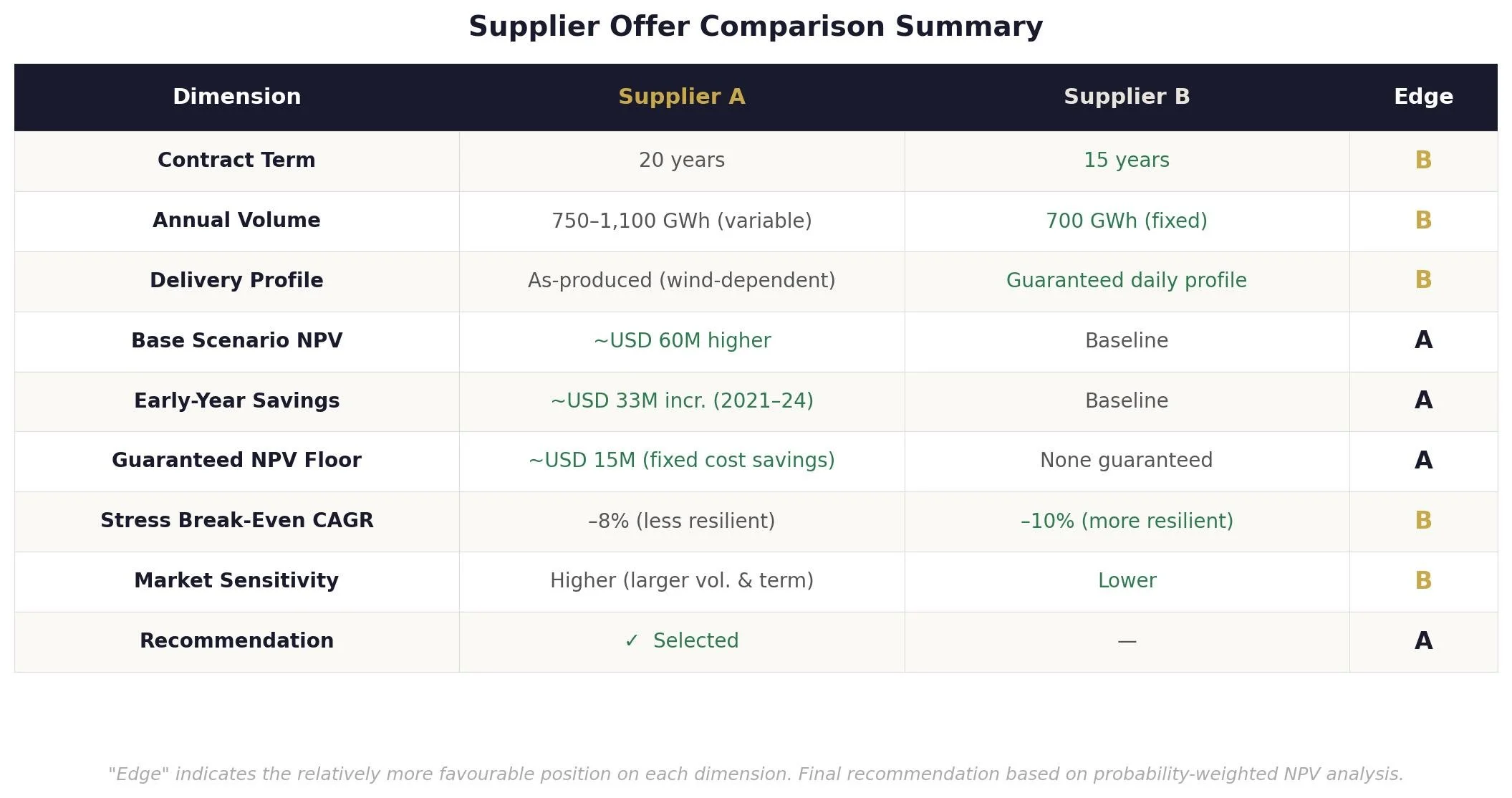 Supplier A offered a 20-year variable-volume contract (750–1,100 GWh/year) with as-produced delivery and an early transition from a legacy power agreement, while Supplier B proposed a 15-year fixed-volume guaranteed delivery contract (700 GWh/year) with a known daily delivery profile. The core analytical challenge was to determine which offer maximized value across a range of future market scenarios — from a base case through to stressed conditions — while accounting for structural differences in volume flexibility, delivery certainty, contract duration, and sensitivity to electricity market price deterioration.